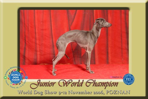 WORLD-JUGEND-CHAMPION 2006 von BELLISIMA DILUPICINO![]() Die Eltern von Belissima sind Baraya el Aakash und Pop Corn du Domaine de Chanteloup Liebe Marina, Lieber Michael macht weiter so! Wir wünschen Euch für die Zukunft viele gesunde und wunderschöne Windspielbabies! |
